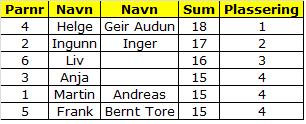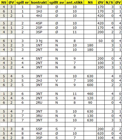 OBS! Det hadde sneket seg inn en feil i spill 8, der resultatet av 4 hjerter ble ført på Nord/Syd med 620. Dette er rettet og vi fikk en liten endring i resultatlisten.