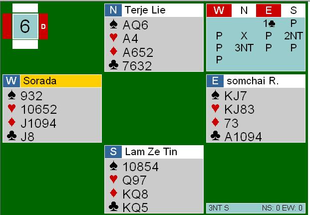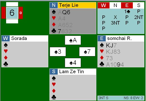 I 5. runde fikk vi imidlertid et interessant spill (nr 6). Terje og Ze Ying kom i 3nt, en kontrakt som er dødsdømt i utgangspunktet og faktisk ikke så urimelig at man kommer i. Ved det andre bordet kom man også i 3 NT og gikk en beit.