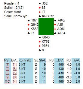Kristen Midtlid og Olav Vaagen satt Ø/V og Kristen startet med pass. Petter Haram i Nord åpnet i 1 kløver som lover 2+ kløver. Denne åpningen er nok ikke en standard 2. håndsåpning, og de fleste vil vel passe med denne hånden. Videre meldingsforløp med Petter og Tommy Skodje er; 1 ruter er svak med ruter eller utgangskrav dersom det meldes major i neste omgang. 1NT kan innholde 4-kort major noe som vises i neste melderunde og man havner til slutt i 3NT. Olav fant ikke noe optimalt utspill når han innledet med liten kløver, dette sikret Petter 2 kløverstikk. Kontrakten står hele veien og til slutt ble det 11 stikk etter et ruteravkast for mye hos øst.