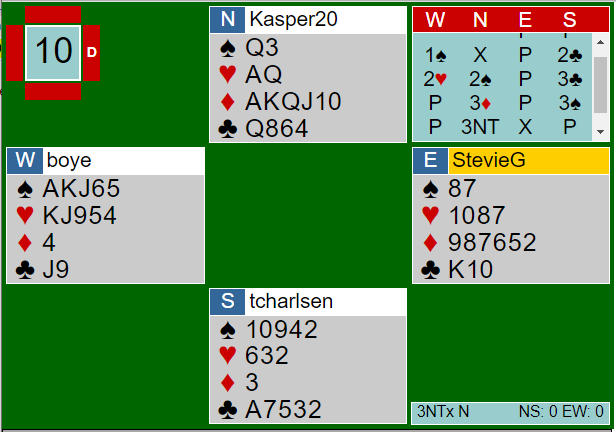 Etter to passer åpnet Brogeland (vest) med 1 spar. Nords kort er vanskelig å melde fordi han ikke har sparstopper. Hadde han hatt det tror jeg beste måte å vise hånden på er å doble og så vise en 18-20 grand i neste runde (siden han ikke meldte inn 1 NT som 15-17/18). Da vest over syds 2 kløver-svar meldte hjerteren sin valgte nord å si 2 spar - krav - og over 3 kløver fra syd sa han 3 ruter. Nå har han vist kanonkort med ruter. Syd syntes han hadde litt å bidra med og meldte 3 spar som antagelig viste litt i den fargen, men ikke en skikkelig stopper siden han ikke sa 2 grand over 2 spar. Da meldte nord 3 grand. Øst mente han hadde noe han også, og makkeren hadde meldt to ganger i faresonen. Så kontrakten 3 grand ble doblet.