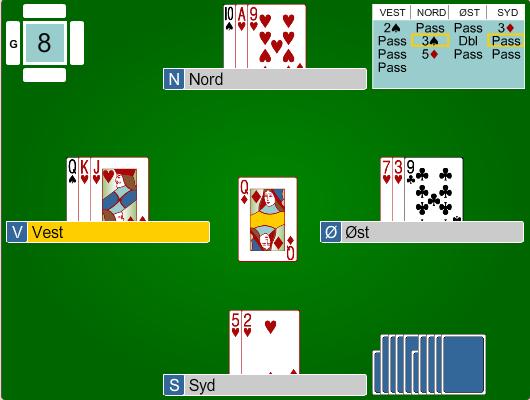 I spill nr 8 i KM singel spilte jeg mot selveste lagkaptein Antix fra laget vårt i NM-lag. Da er det prestisje ute å går, men i siviliserte former, faktisk så siviliserte at man gir tilbake gaver man får under vegs, så også i dette spillet. Rundt bordet satt; N/S; Andreas Kåre Rekdal-meg, Ø/V; Arnt Rune Rausand-Antix. Spillet så ut som du ser under og Antix startet ballet med åpningen 2 spar.