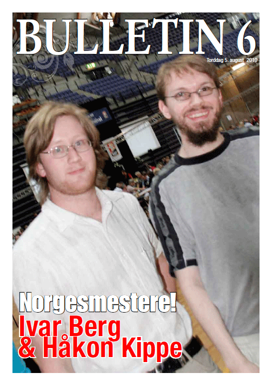 Bulletinredaktør Vegard Brekke kunne presentere Norgesmesterene for par 2010 på forsiden av bulltin 6 fra bridgefestivalen. Ivar Berg og Håkon Kippe er regjerende norgesmestere for par og kommer til Bergen for å bevise at det ikke var ett blaff at de vant NM-tittelen i fjor. Vi har laget ett lite intervju med de sympatiske herrene som du kan lese under LES MER nede til høyre i denne artikkelen.