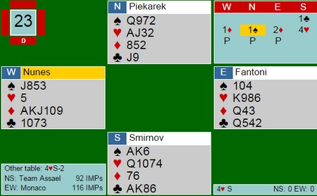 "Alle" trodde vel at 40 IMP skulle holde på 15 spill for Tor-Geir og Fantoni-Nunes. Det gjorde det ikke og Team Assael (Piakarek-Smirnov, Sementa - Tokay) vant med hele 54. Det er et snitt på over 3,5 IMP pr. spill. HER ER HELE KAMPEN.