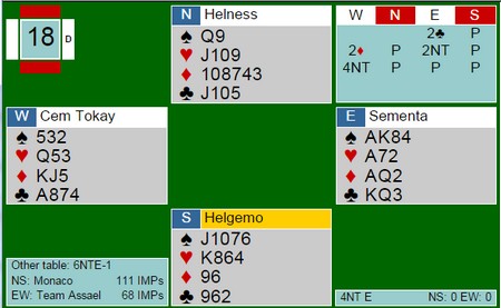 Sånn avgjøres lagkamper. En ser det gang på gang at det er de store spillene som avgjør. Sementa - Tokay passer ut invitten, mens Fantoni - Nunes kommer i 6NT etter en nesten identisk sekvens fram til 4NT. Selv med kløveren 3-3 og hjerterkongen foran damen var det bare 11 stikk. Eneste vinnersjanse i praksis hadde vært 3-4-3-3 / 3-5-2-3 / 3-6-1-3 i syd med hjerterkongen og DKn10 i spar. Da ville han blitt innspilt i spar og måtte gitt bord to i hjerter. (3+2+-3+4 = 12). Så skjønner jeg ikke helt Geir Helgemo sin spilleføring i 4hj i spill 23 Åpent Rom, der han blokkerer trumfen, men det er helt sikkert et poeng jeg ikke evner å få med meg. (tror han planlegger å ta to runder trumf og så stjele den fjerde sparen med hjerterdamen hvis fire spar sitter sammen med tre hjerter. Til slutt kan han klare å få det tiende stikket med hjerter 3 på en kløverstjeling etterpå. Kan det være beste odds?) 10 stikk i lukket etter en flott spilleføring av Smirnov. For meg ser det ut som kontrakten står på å finne sparen, men russeren klarte det likevel med en tøff skivs i spar/kløver mot vest. (Spill 23 - lukket rom) Her trodde Geir Helgemo at julekvelden var kommet svært tidlig i år, men etter ruteresset i utspill så sto kontrakten!! Utrolig. Se også Piekareks fine spileføring i 4sp - spill 29 i lukket rom. Nivået er høyt! _______________________________________________________________________