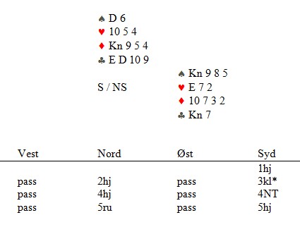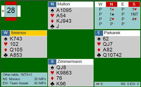 etter overkjøring i siste sesjon mot Team Assael. Hele 70-16 ble tapet på de siste 15 spillene. BBO har ikke lagt ut halvrunden enda, så jeg har ingen spill før litt seinere i dag. Jeg er ikke av de som sitter opp fra kl. 03.00 på natta og ser på bridge. Da er det skjønnhetssøvn her i Søgne. Kmapen endte 136 - 122 i Monaco sitt disfavør: HER ER RESULTATER FRA BRIDGEWINNERS. De som sier at resultatene fra arrangøren er så bra, får bare fortsette med det. Jeg finner ikke en damn shit fra Vanderbilt og jeg er ikke verdens dårligste til å leite på nettet. Her er et spill fra forrige runde der Zimmermann - Moulton var heldige. 4hj står fordi det sitter VELDIG greit. Sparkongen i kapp, hjerteren 3-2 pluss at spillefører må finne ruteren. Det kom hjerter ut og spar knekt som seilte. Så ruter til knekten. Jeg er ikke sikker, men kan ikke øst beite nå ved å stikke og spille kløverdamen? Blir ikke bordet drept og spillefører henger med to kløvertapere? Mulig han kan lasje kløverdamen og så bruke tieren neste gang hvis øst spiller mer. Eller kan øst skifte? Grunnen til at jeg skriver om spillet er nord sin 2hj andre gang. Viser det tillegg? Jeg mener noen har fortalt med at nord viser 4-3-5-1 og omtrent 15-17. Med en vanlig 12-14 vil han passe 1NT fra makker fordi 2hj på 4-3 hvis makker er svak og har fire dårlige hjertere er da ikke noe sted å være? Uansett hardt av Zimmermann når har ikke har rutertilpass og kløverkongen er mer eller mindre bortkastet mot makkers singelton. Hva mener du? ____________________________________________________________