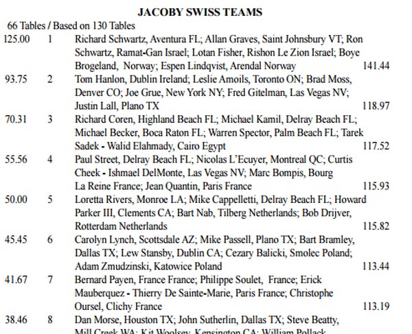 Mange av lagene som blir utslått i Vanderbilt går inn i Jacobys Swiss. Det betyr at nivået er svært høyt mot slutten og når Espen og Boye vinner med den marginen du ser under, er det kun ordet "imponerende" som dekker. Gratulerer!! HER ER SISTE BULLETIN MED ALLE RESULTATER