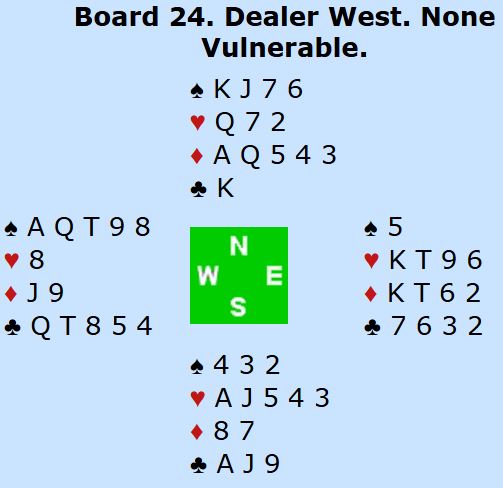 Ø/V har 25 HP til sammen og balanserte hender. Det er normalt å ende i 3NT, men slikt det sitter er det i praksis nokså umulig å vinne den. Om ruteren treffes er man et stykke på vei, men det ser likevel ut som det er langt frem til ni stikk. Alle som bruker 15-17 grand kommer i 3NT hvis nord passer og øst åpner med 1NT. Men om de bruker 13-15NT går det an å si pass på 1NT med vests flate 10-poenger, vel vitende at det er 23 eller 24 poeng til sammen de fleste gangene, kanskje 25 noen ganger,