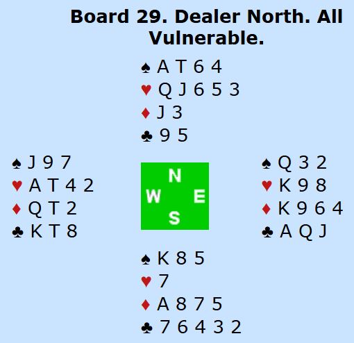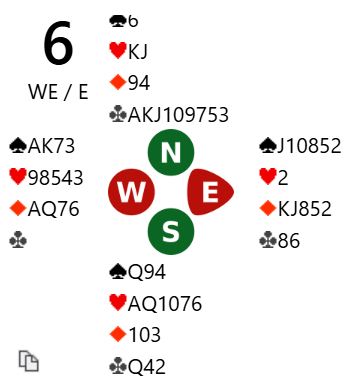 Der Brogeland og og hans makker Anklesaria (India) satt N/S spilte nord Ø/V 5 ruter med elleve stikk (Ø/V +600). Det er vel egentlig et ganske normalt resultat. Ø/V kan også vinne 5 spar, men ikke 6 spar selv om sparen tippes rett. Det går ikke å trumfe opp to kløvere og samtidig få løst sparen med null taper. Men det står i 6 ruter om sparfargen tippes som ikke er umulig å gjøre siden nord i meldingsforløpet vil ha vist veldig lang kløverfarge.