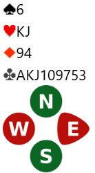 Fra vest kom kløver 6 i utspill til nieren, tieren og kongen. Det ser unektelig ut som det er er et stykke unna ni stikk, spesielt når en med åpne kort vet at hjerterfargen ikke sitter snilt.