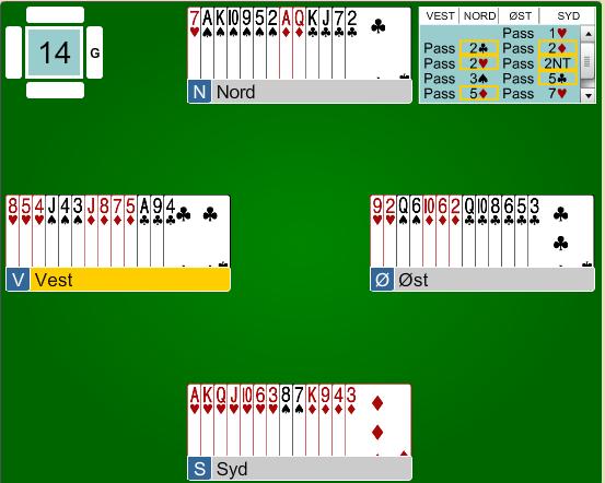 Bavianen i syd åpnet med 1 hjerter. 2 kløver fra Petter var enten 10-11 og 3 korts hjerterstøtte eller utgangskrav. Torstein meldte 2 ruter som nok var en undermelding her, men som etter systemet skal vise 11-14 og benekter 4 korts spar. 2 hjerter fra nord var utgangskrav nå, og 2NT viste en enseter fra Torstein. 3 spar var naturlig og 5 kløver fra syd var Exclusion med spar som trumf. På 5 ruter som viste 0-3 (AK i spar og A ruter) la Bavianen kontrakten i 7 hjerter. Spillerføringen var en formalitet etter hjerterutspill.