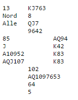 På kløver 10 var nord ferdig mann. Hvis han kastet ruter dame ville spillefører få ruterstikk - det tiende - og sparfinessen ville gitt kontraktstikket. Nord valgte å kaste en spar. Da forsvant ruter 8 fra øst, og avslutningen ble spar til damen og spar ess. Østs spar 9 var blitt til stikk - det ellevte.
