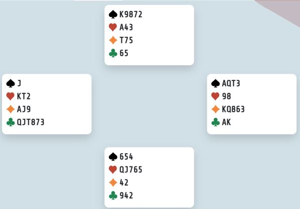 Hoftaniska - Charlsen meldte kontrollert, og de fant rutertilpasningen på tre-trinnet. Da meldte Hoftaniska (øst) 3 hjerter for å finne ut mer, og Charlsen sa 3NT. Med ekstra styrke gikk øst videre med 4 kløver. Da vest meldte 4 hjerter doblet nord. Doblingen var ikke helt heldig, for det ga litt hjelp til det norske paret. For nå så de faremomentet med å ha øst som spillefører, hjerter fra syd truer. De endte derfor i 6NT, en perfekt slem så lenge vest er spillefører sånn at hjerter konge er beskyttet. Det var ingen problemer i spilleføringen i 6NT av vest, det er jo 1+0+5+6 = 12 sikre stikk,  DE BOTTON +990.