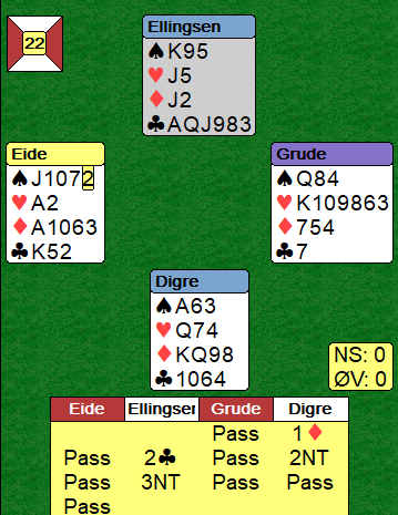 Mot Eide sin 5 kløver tok nord for A-K i hjerter før han skiftet til spar. Det ble feil, nå fikk spillefører beholde de to hjerterstikkene som ga avkast for to ruter. Med en tredje runde hjerter blir det bet, syd trumfer, og selv om spillefører trumfer over blir det bet med kun et ruteravkast på hjerter og det blir en rutertaper til slutt. Utgang i sonen mot kun 100 i beteplukk ved det andre bordet ga Studentenes BK 11 IMP.