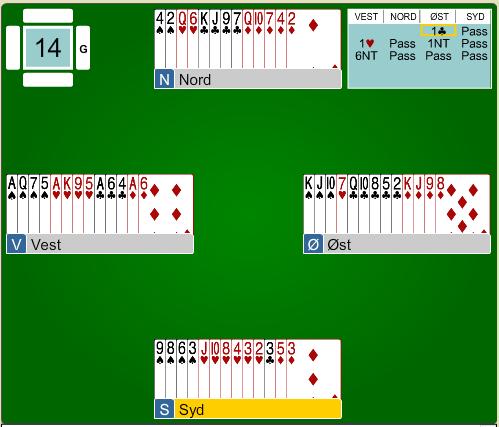 Start med kløver Ess eller kløver til essen. Derfra spiller du liten kløver. Bekjenner Syd med liten kløver legger du 10ern. Det gir de beste oddsene. For øvrig var det av 9 bord 4 spillere som fikk 12 stikk, 2 gikk beit i 6 kløver, en var i 3 hjerter doblet og to fikk hjem 6NT.