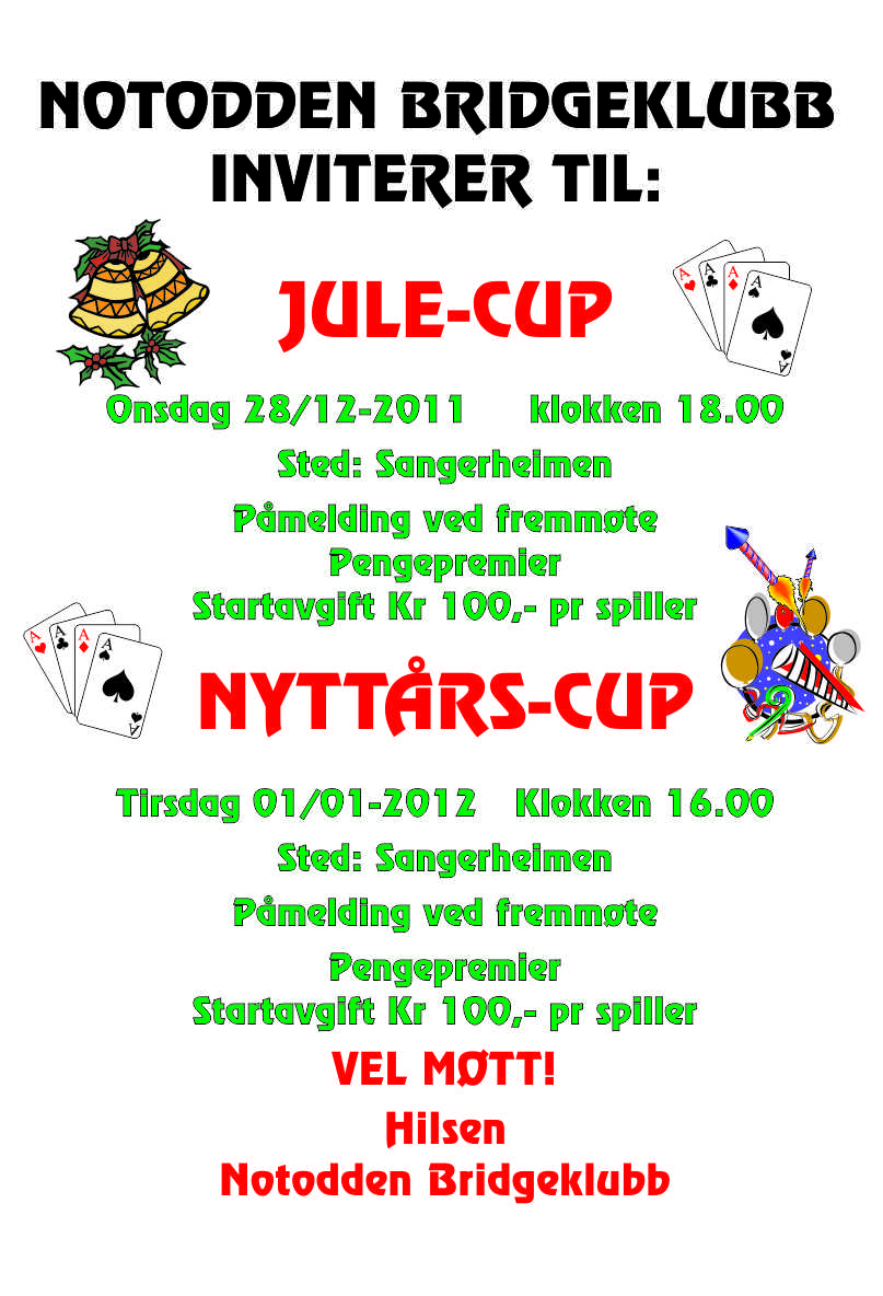 Ellers minner jeg om vår juleturnering på Onsdag 28. desember kl 18 og vår tradisjonsrike 1.nyttårscup kl 16. Se Terminlisten for mer informasjon. Eller trykk her Vi må heller ikke glemme Joleturneringen i Seljord 27 desember. Ingen Notodden par har meldt seg på her