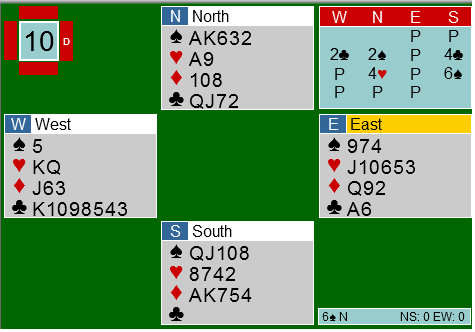 I oppgaven så er det reverse dummy som må til for å vinne kontrakten. I stikk to spilles hjerter til ess og ny hjerter. Vest er inne og har ikke mer trumf igjen. Uavhengig av hva denne spiller nå, så rekker spillefører å trumfe all hjerter hos blindemannen, trumfe god ruteren og ta ut trumfen for 12 stikk. 4 svarte på oppgaven og alle 4 hadde riktig løsning. Det kan du se her. Kort for kort kan du se her.