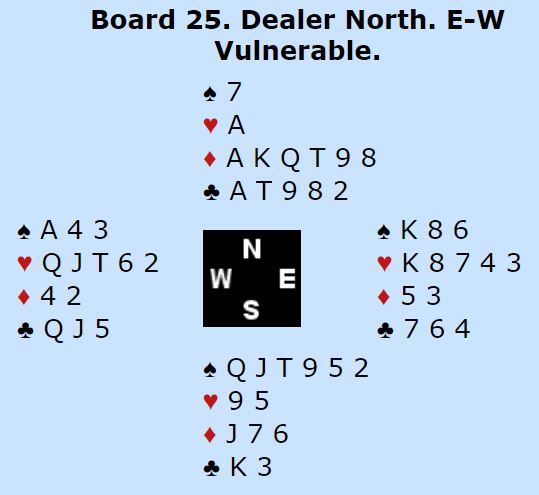Slik gikk spillet, kl A, kl 2 til røff, spar til knekten og begge fulgte. Da tok Vest de to godspilte stikkene i kløver og sakte en ruter og en hjerter. Avslutningen ble å satse på finesse i ruter, og da ru 7 ble spilt til liten dame og lavt kort fra Syd også var resten enkelt! 13 stikk ga ren topp!