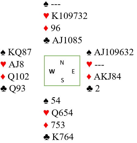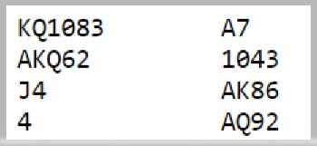 I damenes parmesterskap kom dette interessante spillet hvor mye ble avgjort av hvordan kortene satt hos motparten. Det var imidlertid noen interessante poeng både i spilleføringen og meldingene. Slikt er kostbart, men slike spill er enda verre om det hadde vært lagkamp.