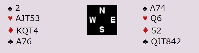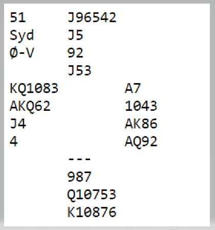 Meldingene avhenger selvsagt av om motparten melder noe, og det kan godt hende i dette tilfellet hvor N/S er i gunstig sone. Men slem i hjerter er fint å være i, og det kan vel godt være en ganske brukbar storeslem også? Det er litt hardt med 7 hjerter. Men om hjerteren ordner seg (3-2 eller knekten singel) er det nesten is og brus om det spilles korrekt.