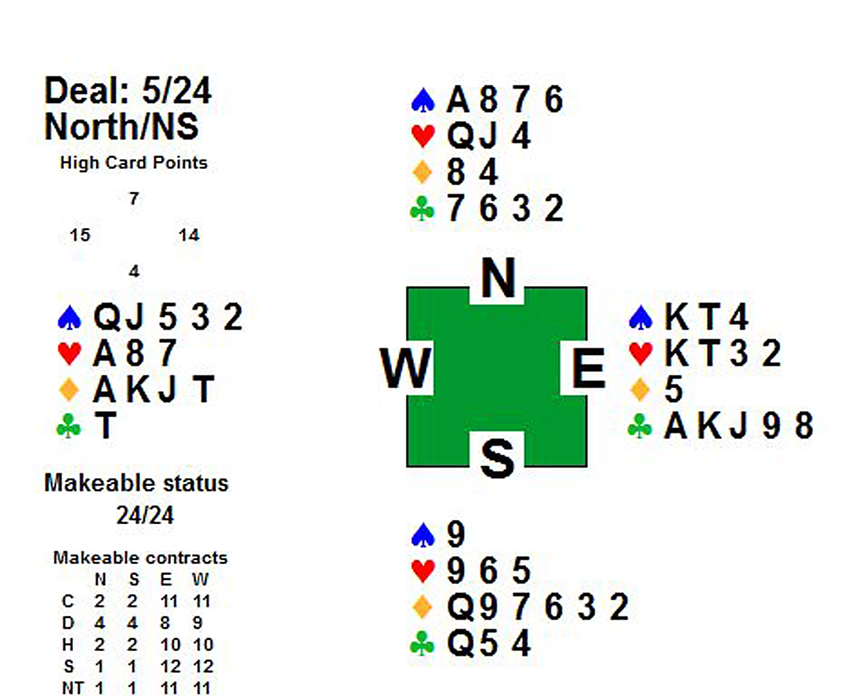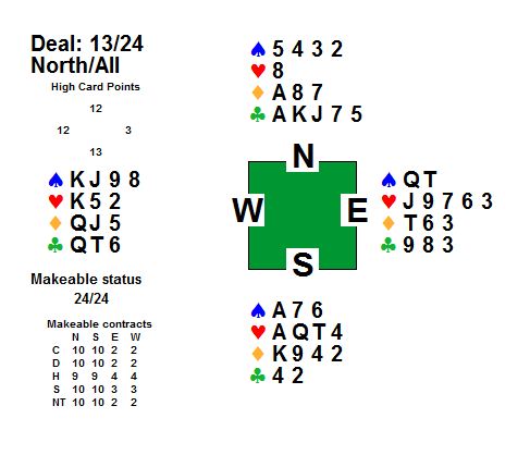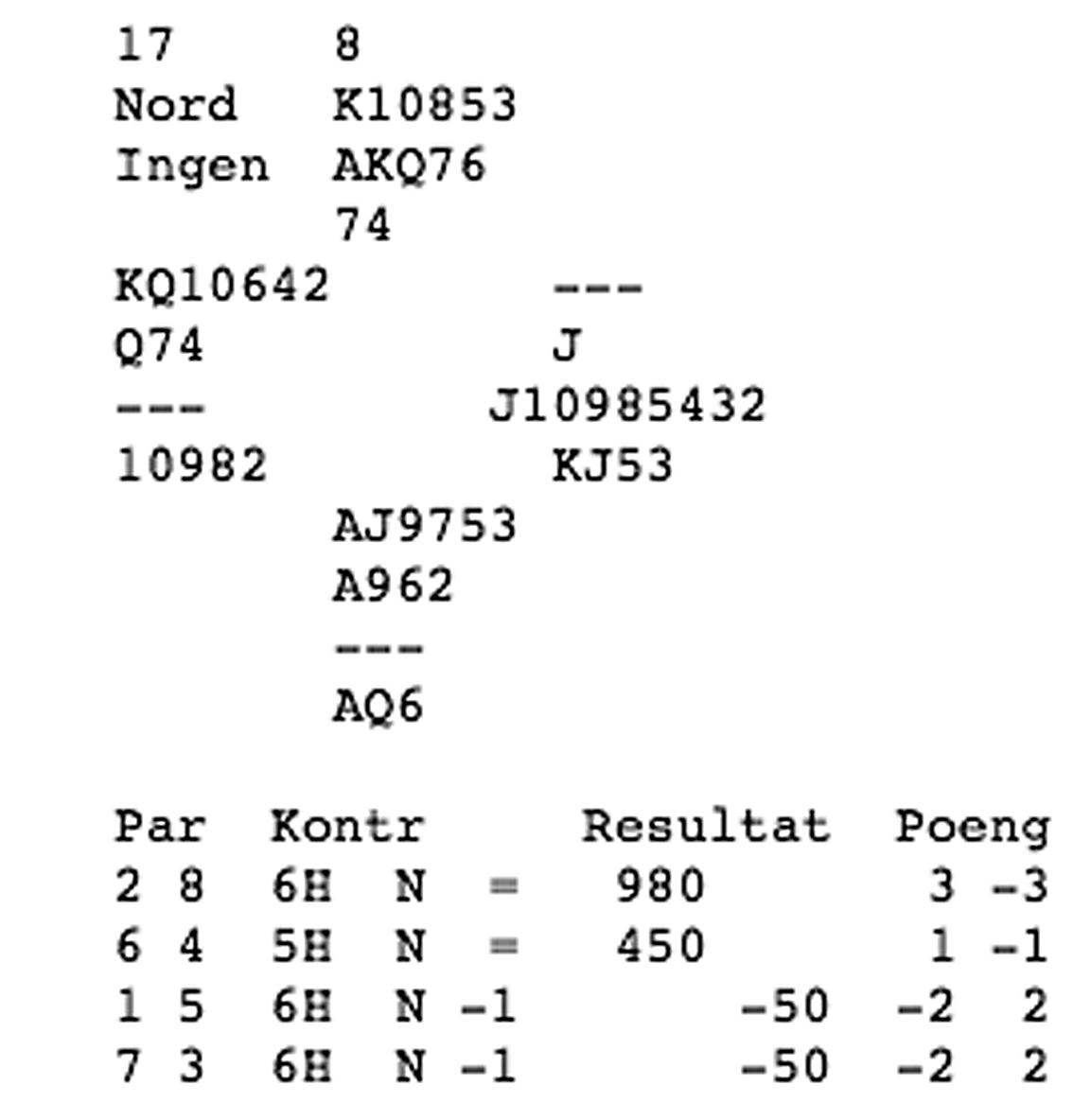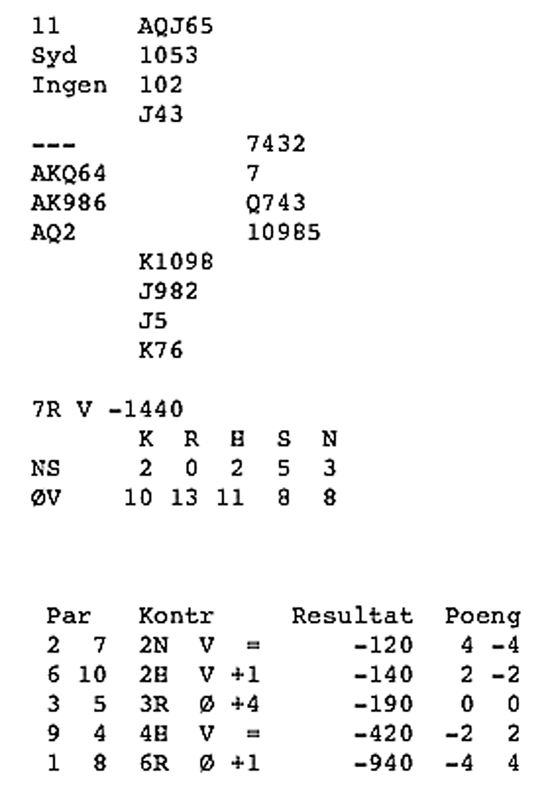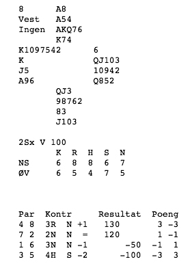 Første spelet var det tolv stikk i hjarterkontrakt. Ingen nord-syd-par klarte å melda denne slemmen, men ein speleførar fekk i alle fall tolv stikk. Dei som fekk mindre stikk har sikkert prøvd sparfinessen, men beste speleplan er sikkert å spela tre gonger spar frå topp og bruka ruter konge som inntak til dei godspelte spar-stikka. Det gjev 5 sparstikk, 5 hjarterstikk og 2 ruterstikk så lenge begge majorfargane sit 3-2 hos motparten. Neste spel var det enno fleire stikk, 13 i både spar og grand. 6 sparstikk, 3 hjarterstikk 3 ruterstikk og eit kløverstikk kunne innkasserast frå taket her. Til slutt var det aust-vest som hadde slem. 12 stikk i hjarterkontrakt denne gongen, og kun trumfen 3-1 imot gjorde at det ikkje var 13 stikk i dette spelet og. ---------------------------------------------------------------------------------------------------------------------