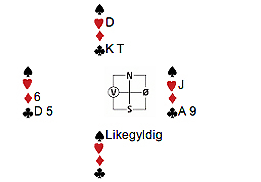 Når siste ruteren no blir spelt frå vest er det godnatt for nord. Lar ho hjarterdama gå, står knekten i aust. Kaster ho kløver, så kaster bordet hjarterknekt, og speleførar får siste stikk på kløverdama.