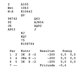 Kontrakten blei 3 NT på nord si hand, etter eit meldingsforløp der Anne Merete i aust hadde vore taus om sparfargen sin, medan Torhild i vest hadde vore inne med ei rutermelding. Med eit slikt meldingsforløp var ikkje ruter knekt ut frå Anne Merete unaturleg.