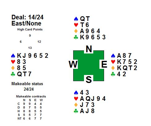 Denne slemmen er klokkerein, men ikkje så lett å melda. + 22 til paret som kom i 6 spar, - 11 til dei som ikkje kom ut.