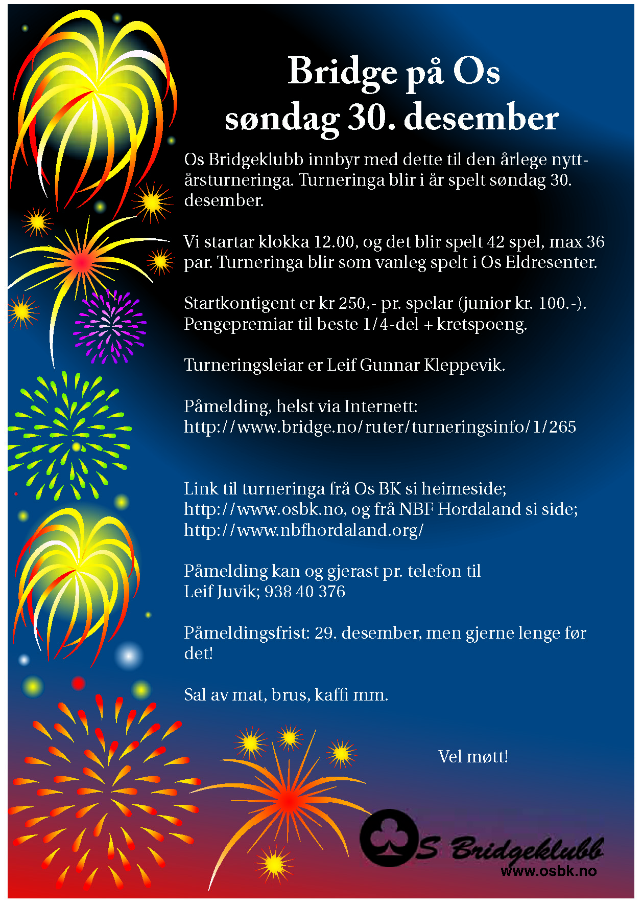 Her er innbyding til årets nyttårsturnering, som i år blir spelt søndag 30. desember. Link for påmelding ligg under fana Nyttårsturneringa over eller her