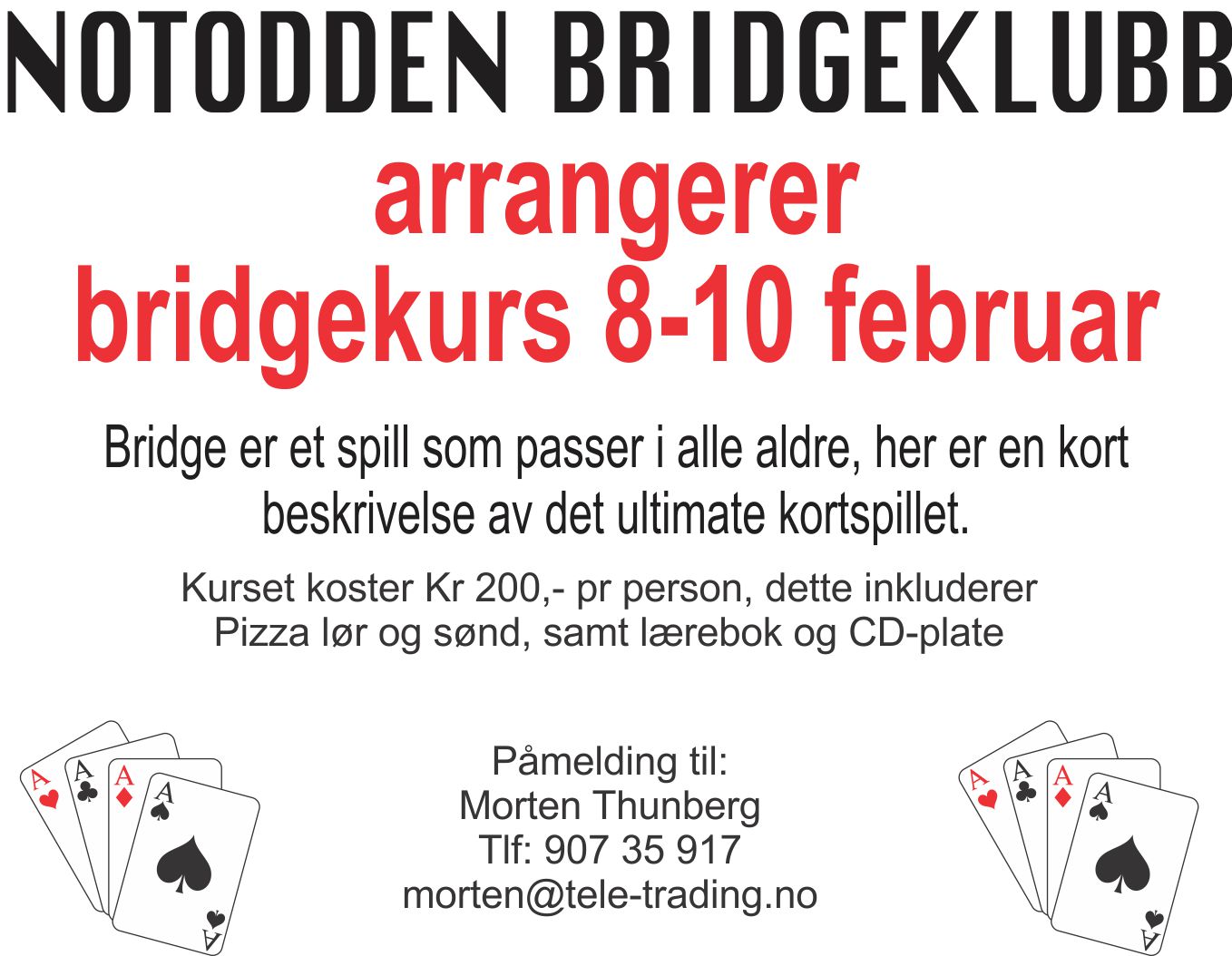 Vi arrangerer BRIDGEKURS 8-10 februar på Nielsen Trafikkskole. Det vil bli litt teori, men prøver å basere dette med mye spilling denne helgen. Vi vil følge opp en og en kursdeltaker etter kurset er ferdig. Vi håper du kan spre dette budskapet, spesielt til dine barn, barnebarn, nieser/nevøer etc. Vi trenger din hjelp for å få inn nye spillere ! Kurset koster Kr 200,- dette inkluderer pizza lørdag og søndag, samt bok og CD plate. Det er påmelding til Morten ! Trykk her for å lese hele innbydelsen.