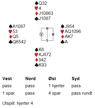 Hilda tok ingen sjanser i dette spillet sist tirsdag, og ble kreditert med ren topp! Istedet for å overlate skjebnen til en enkel finesse lot hun de små grå ta kontroll over spillets gang. Hun satt i vest, og kortene var fordelt som følger: