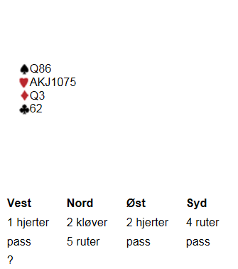 God mat og ei lettfattelig saksliste gjorde sitt til en hyggelig aften i Revmastua. Mest furore skapte budsjettet der det var satt opp innkjøp av ny pc og hårløs mus. Det var mest prisen på det hele som skapte diskusjon i så måte, og ikke selve innkjøpet. Deretter var det trekking av makkere og hygge-bridge. Selv fikk jeg gleden av å spille med en av klubbens kvinnelige spillere, og til tross for en tøff start berga vi oss inn like under middels til slutt. At vi ikke kom over middels kan blant annet skyldes spillet under, jeg sitter vest med følgende kort.