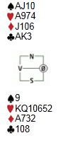 Som dere kanskjer skjønner, jeg er en iherdig forkjemper for trumfutspillet. Regelen min er som følger: Trumf ut er kanskje ikke alltid det beste, men sjelden helt feil. Man skal ikke blindt spille ut trumf ved enhver anledning, men trumfutspillet har den fordelen at det ofte er et nøytralt utspill og at det kan ødelegge for stjelemulighetene for motparten. Sør i dette spillet, som er henta fra tirsdagen, fikk liten kløver ut i 6 hjerter:
