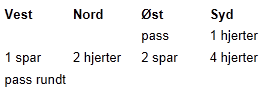 I dette spillet, som jeg har sakset ut fra Martn'sbridgen på Koppang, har du som syd havnet i 4hjerter og får liten spar ut. Hvordan legger du løpet?