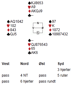 Undertegnede var godt fornøyd med tirsdagskvelden, og kunne sammen med makker innkassere en seier. Det var 3 bord, og da spiller vi IMP-over-feltet; en glimrende scoringsform ved få bord da en får bedre betalt for gode spill og blir straffet hardere ved dårlige spill. Som seg hør og bør. Landskamp og fuglejakt kan ta del i skylda for et lavere oppmøte denne tirsdag, og jeg kunne på forhånd fortalt at ihvertfall den ene aktiviteten var bortkasta tid.
