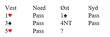 Her er det uansett opplagt å svare 1 spar siden vi jo godt kan ha ti-korts trumftilpasning i spar og bare åtte-korts tilpasning i hjerter. Og det er faktisk akkurat slik det er, for over 1 spar hopper vest til 3 spar! Det viser fire-korts sparstøtte og en hånd verd ca. 16 poeng, «give and take», og øst ser at slem skal meldes.