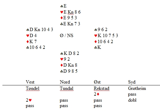 Jeg husker at jeg selv satt i syd med Glenn Grøtheim sine kort og fikk akkurat det samme meldingsforløpet mot meg. Jeg passet "selvsagt" ut i fjerdehånd og tenkte ikke mer på det, selv om motparten gikk de samme fire beitene mot meg. Jeg henta 200 beitepoenger, mens Midt-Trøndelag satte 800 av de samme på sin konto. Kanskje ikke rart at noen vinner, mens andre sliter for å klamre seg fast hvert eneste år?