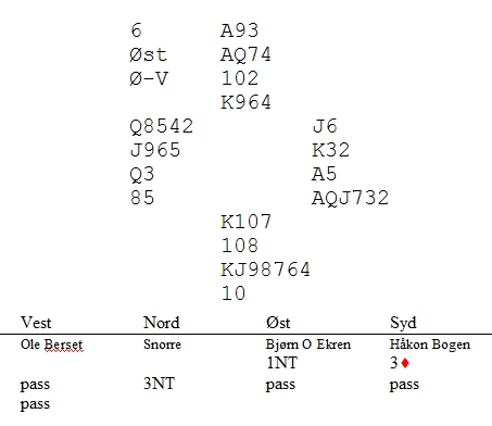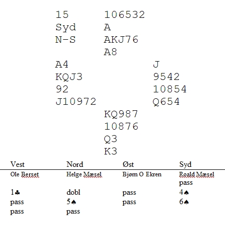 Jeg meldte 3NT like mye fordi det så ut som kontrakter spilte bedre fra min hånd enn fra makkers i syd. Det kunne faktisk være sånn at 3NT sto, mens 3ru var beit. Hvor sterk makkers 3ru er, vet jeg heller ikke. Håkon Bogen er jo ikke kjent for å pingle i meldeboksen, men fin ruter og et inntak kanskje? Kløverdamen ut til kongen og nå sto det hele på rutervalget. Åpneren har helt sikkert ruteresset, men det var plass til en dame på den andre siden. Derfor ruter til kongen og mer ruter var et heldig valg og +430 på bok. Det ble verre etterpå for å si det mildt.. Så var det Helge og Roald Mæsel som hadde et fint meldingsforløp. Helge oppvurderte hånda til å være verdt en opplysende dobling fulgt av melding for å vise en spillesterk hånd med minst 16hp. Når Helge hadde vurdert hånda til å være verdt en dobling første gang, fulgte han nå opp med 5sp. "Trumfen min er litt vesen, makker. Kan du hjelpe meg der?" "Yess, kjære bror!", kom det fra den peneste av brødrene og 1430 i hus.