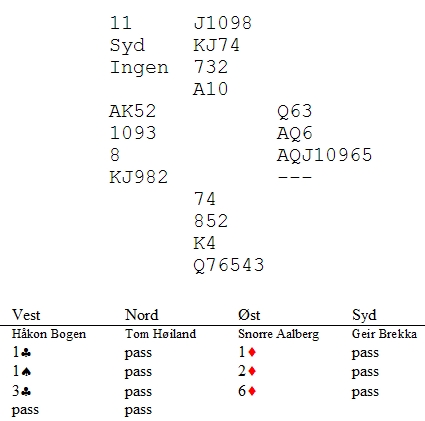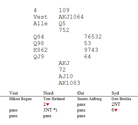 Mange vet at jeg og Geir Brekka har tøffe dyster på BBO. Det er stor prestisje å vinne på nettet, men når vi møttes i 1.divisjon i helga var det likevel en annen dimensjon. Jeg og Håkon Bogen fikk en kanonstart og jeg tipper vi leda med 25 IMP (minst) etter fem spill. Geir og Tom hadde brent to utganger, gått beit i en hard slem og fantomstampa for 300 mot utgang som i praksis var beit. 300 var også ei beit for mye, tror jeg. Nå kom det to spill der vi kunne satt spikeren i kista og slått av lyset samtidig. I det som kommer her skjønte ikke Håkon hvilket glimrende avkast han hadde gjort i stikk en og jeg tror han fikk litt panikk da han noe overaskende kom inn i stikk fire. 3NT: maks uten singelton. Med spar ut stikker Tom i bordet og tar hjerterfinessen. Inn i bordet og nok en kapp.12 stikk. Med ruter ut taes kappen som ryker til kongen. Hjerterfinessen sikrer 12 stikk igjen. Jeg spilte ut kløver til bordets ess og nå la Håkon knekten (!). Dette fikk Tom til å tro at jeg hadde spilt ut en norsk sekser fra D964. Derfor turde han ikke ta hjerterfinessen, fordi hvis den ryker til damen beiter en kløverstjeling. Hjerter til EK og mer hjerter til Håkon i vest. Nå likte han seg ikke og angra sikkert som en hund at han hadde lagt kløver knekten. Han var innspilt og måtte spille opp til kapp i alle tre farger. Den eneste fargen som kunne være ufarlig ,var ruter. Av en eller annen grunn spilte han kongen(!). Det kan hende det var for å beskytte seg mot en evt skvis i tre farger. Han tenkte også at med ruterdamen i tillegg til EKJ10xx i hjerter, ville Tom åpnet med 1hj og ikke svake to. Nå sto dette og Tom fikk de samme tolv stikkene som alle andre i slem. La Håkon spille en liten ruter til damen som vinner stikket. Jeg kan ikke vite hvordan Tom spiller, men jeg er 99% sikker på at han spiller kløver til tieren. Husk at han ikke tok hjerterkappen av akkurat denne årsaken. Da blir det beit!! Det finnes en eneste vinnervariant. Inne på ruterdamen spilles ruter til esset, kløver konge (Vienna coup), hjem på ruter stjeling og trumfen til bunns. I tokort-possen har han en spar og en kløver på hånda og KJ i spar i bordet. Håkon må blanke spardamen og den må toppes ut. Tom har teft som bare det, men med den uheldige starten de hadde fått er jeg rimelig sikker på at det ville blitt beit. 15 IMP i sving!! Det ble uavgjort i vårt innbyrdes oppgjør. 34-33 på de første 12 spilla hvis jeg husker rett. _________________________________________________________________________________________ Så kom dette. Jeg skal ikke forsvare meldingene mine veldig, men kunne ikke finne ut noen ting over 3kl. EK i spar kunne vært borte, men det kunne også være nedlegg med de riktige kortene hos makker. Jeg gjetta på at kontrakten sto på en kapp og gikk for gull. Nå skal jeg fortelle deg hvor nære jeg var til å vinne. Du ser at Geir i syd har hjerter åtte? Hvis jeg hadde hatt åtteren, ville 6ru stått. Hvis jeg hadde hatt syveren og Tom åtteren, ville det også stått. Det er små marginer vel? Jeg fikk hjerter to ut og jeg spilte i praksis bort kontrakten i stikk en da jeg brukte bordets tier. Legger jeg liten, må Tom bruke syveren. Det klarer han ikke. Han klarer kanskje å legge knekten og da er jeg sjanseløs (?) til å ta dobbelkappen fordi jeg tror kaninen han kongen. Jeg bør legge liten i bordet, men om jeg velger nok en hjerterfinesse hvis Tom bruker kongen, er jeg ikke sikker på. Det er utallige skvisvarianter som du sikkert ser. Spar til bordet og ruter til kapp. Det gikk ikke bra. Mer spar til damen og all trumfen unntatt den siste. Nå er stillingen: Jeg tar for ruter to. Sitter sparen 3-3,er spillet over. Hadde Geir hatt kløver ess, ville dette vært en klassisk tosidig skvis der syd må holde kløveren og nord sparen. Hjerter seks ville tatt det siste stikket. Hadde jeg hatt Geir sin hjerter åtte, ville Tom vært ferdig for lenge siden. Selv uten kløveresset ville han blitt skvist i trekortpossen. Jeg trodde altså jeg hadde vunnet en steinhard slem på tosidig skvis mot kaninen i avgjørende oppgjør i 1.divisjon!! Pulsen min var minst i 180 og sank brått da det ikke satt slik og Geir hadde holdt på alle hjerterne sine.Han tok beita med hjerter åtte!!