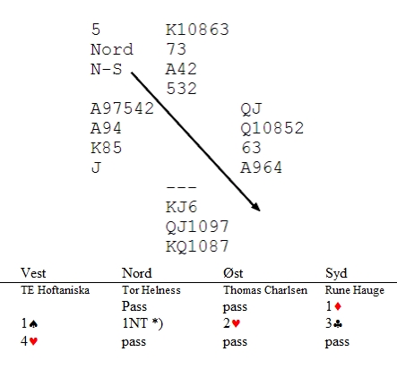 og det var også denne gangen Hoftaniska -Charlsen som var involvert. Motstandere var Tor Helness og Rune Hauge. Ingen av de to appellene jeg har dekket er enda behandlet av lovutvalget. Jeg har ikke fått snakket med turneringslederne som var involvert. Problemet denne gangen var også en manglende alert. (Også denne gangen tar jeg forbehold om å ha blitt fortalt rett om de faktiske forhold. Jeg har ikke sett selve appellskjemaet) Det som som skjedde var syd forklarte til vest at 1NT viste kløverfarge. Nord sa ingenting til øst fordi 1NT er naturlig. Rune Hauge blanda med en annet posisjon der 1NT viser kløver. Jeg undrer meg over at Rune Hauge ikke meldte (minst) 5kl når han trodde makker hadde kløver, men det har sikker han en forklaring på. Vest klinte til med 4hj. Offensivt, men langt fra hodeløst. Mer enn f.eks KDxxx og litt i spar kan være nok til at utgangen står. Ruter konge ser ut til å sitte fint plassert og singel kløver er et pluss. Nedsiden er at hånda hans kan bli uten inntak til sparen hvis han må stjele kløver, men oppsiden er at stjelingen(e) på den korte hånda kan være akkurat det som trengs for å vinne ti stikk. Det er mye som tyder på at makker har bare fem hjerter siden han passet i åpning. Nå satt dette grisesurt og utgang var helt umulig å vinne. Omtrent halvparten av bordene i 1. og 2.divisjon spilte hjerterkontrakter og gjennomsnitlig ble det vunnet syv stikk. Tor og Rune spilte elendig i mot og ga vekk hele ni stikk. I etterkant sier de at de sikret å beite kontrakten og brydde seg ikke all verden om beit to og tre utenfor sonen. Når spillet var ferdig, kom det for en dag at Tor ikke hadde kløver, men hadde meldt 1NT naturlig. Da mente vest at hvis han visste at det var sparhold bak han, ville han kun invitert til utgang, ikke hoppa til 4hj. Han sa også at makker ville ha passa invitten. Jeg tror ikke noen spurte hva Rune Hauge ville meldt over 3hj, men 4kl ser da ikke dumt ut? Står det ikke nesten 5kl i syd? Igjen sier jeg at det ikke noe galt i å tilkalle turneringsleder. TL gir ØV medhold og justerer kontrakten til 3hj med 9 stikk. Nå blåser Tor Helness seg opp og forklarer TL at mot 3hj hadde de selvsagt spilt annerledes i mot og ville hundre av hundre ganger beita 3hj hvis det var kontrakten. "Det spælle ingen rolle om spillefører er i 3hj eller 4hj. Scoren vil bli dein samma uansett!". TL sier at her er lovene beinharde og når kontrakter justeres opp eller ned, følger antall stikk som aktuelt ble vunnet med på lasset. Rett eller galt, men det er loven blir jeg fortalt av Markus Bruno. Denne gangen har jeg på en måte mer forståelse for protesten siden vest trodde kløveren var i nord og ikke i syd, men for hans vurdering når han meldte 4hj kan jeg ikke skjønne at det skal bety noe avgjørende . Om to av nord sine spar byttes til kløver og to av syd sine kløver bytter til spar, ville meldingene kunne gått akkurat likedan. Nord har Kxx, xx, Exx, Dxxxx og syd har xx, KJx, DJxxx, KJx. Det ville fremdeles være beit(er) i 4hj. Turneringsleder dømte altså kontrakten til 3hj - 9 stikk og 140 ØV. Det var ett av 42 bord som hadde den scoren. Ser du de to spillene samlet, har TL altså oppjustert 3hj til 4hj i den forrige appellen fordi da satt det snilt. I denne satt det surt og da har TL nedjustert 4hj til 3hj. Det kunne meget godt vært slik sitsen var slik at det var best å være i den motsatte utgangen. I den siste har ØV oppnådd et resultat som ble gjentatt på et eneste bord. Jeg vet ikke hva du synes om dette, men slik jeg ser det er vi på ville veier. Lovene må gjenspeile det som det store flertallet av spillere mener er fornuftig. Lover og regler kan ikke være slik at det gir et urimelig godt resultat for den ikke feilende side. Loven må sikre at uforskyld skade blir rette opp, men ikke mer enn det. Joda,manglende alert er et alvorlig brudd, men hvis ingen betydelig skade har skjedd, bør det kun gies en advarsel til den feilende side.
