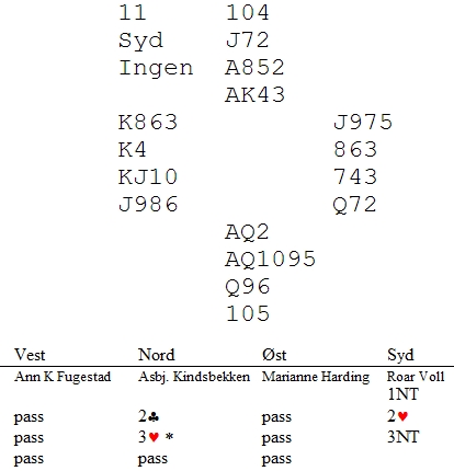 Se på spillet under og fokuser på nord sin hånd før du ser "løsningen" til Roar og Asbjørn. Det er et klassisk problem når du har to små spar. Motparten kan ha fem stikk i den fargen og de gangene du har 5-3 i hjerter, kan det være rett å havne i 4hj. 5kl/ru kan også være et alternativ hvis begge har to små spar og ikke 5(4)-3 i hjerter. Mange søkte i Stayman to ganger og fikk høre at makker hadde fem hjerter. De fleste parkerte da i 4hj, en kontrakt som ikke kunne vinnes med normal spilleføring og kløver ut fra vest. En del spiller 1NT - 2NT for å vise en liten dobbelton.3kl spør hvor og svarhånda viser stegvis hvor det svake punktet er. Roar Voll og Asbjørn Kindsbekken hadde en annen fiffig variant. 3hj viser akkurat 2-3 i major og sparen er svak. Da var det lett å melde 3NT for syd. Med spar ut var det minst ti lette stikk.