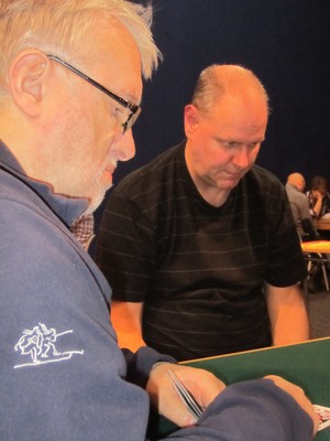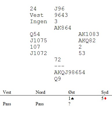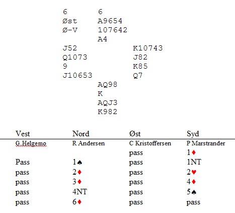 Bridge is a bidders game, er det noe som heter. Med det menes at veldig mye avgjøres i meldingsforløpet. En annen "sannhet" er at 5-trinnet tilhører motparten og at en sjelden skal melde/stampe over motpartens meldinger på 5-trinnet. I bridge er det ingen sannheter, for i dette spillet måtte øst melde over 5ru med sin sterke hånd. Mange doblet i øst og måtte se at NS tok elleve lette stikk, tolv uten spar ut. Rune Andersen og Tom Høiland i kamp..