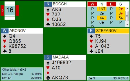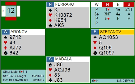 Det ser så lett ut når Italia er på BBO. De gjør nesten ikke feil og i tillegg virker det som de har flaks. Selvsagt stemmer ikke det i det lange løp, de er bare bedre enn motstanderne. Her er noen spill fra finalen mellom Italia og Bulgaria. Spill 5: Jeg ble faktisk mest imponert over Ferraro, Sementa og Duboin i denne turneringa. Bocchi - Madala vet vi er svært dyktige, men de andre tre spillerne var minst like giftige. Dette spillet er slettes ikke noe kunstverk, men det er god og aggressiv bridge som belønnes med +800. Spill 16: Jeg mener at Italia spiller 15-17 i alle soner, i alle fall er det det som står på systemkortet. På den annen side bløffer sjelden spillere på NT-intervallet med balanserte hender, så de har sikkert endret. 3ru viser kløver, mens 5sp ber makker se på kvaliteten på sparen. Faktisk står 6kl/7kl og 6sp på omtrent det samme, nemlig at sparen løser seg uten taper. I alle fall med hjerter ut. 6kl var gevinstspill siden Bulgaria ikke kom lenger enn til utgang. Spill 20: