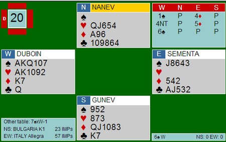 Skal en vinne tette lagkamper, er dette IKKE måten å gjøre det på. Selv på dette nivået gjøres det stygge, stygge feil når de kommer i storeslemmer med ett ess vekk. Kanskje var det en kalkulert risiko der vest trodde makker hadde EK i kløver og kontrakten sto uten ruter ut? Det høres i så fall desperat ut, men de lå på dette tidspunktet godt bak allerede. Sterk andreplass til K1 - Bulgaria, selv om de ble rundspilt i finalen. Spill 20: italia meldte lett 6sp på det samme spillet. Legg merke til 4ru som renonsvisende i hjerter. Dette for at åpneren skal ha to muligheter til å si hvor godt renonsen passet. 4sp betyr at "det suger", men 4hj sier at "det er ikke helt galt, men jeg kan ikke gå på til slem alene enda.."