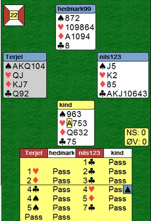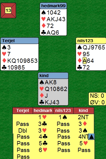 I spillet litt lenger nede svikta slemvvurderingen, men i dette gikk det strålende!! 2NT : Støtte 3kl : tilegg 3ru : singel (!). Nord hånd voks til himmels. diverse cuebid 5hj : Pass hvis du (mot formodning) ikke skulle ha ess. (5kl --> 0/3 essverdier)