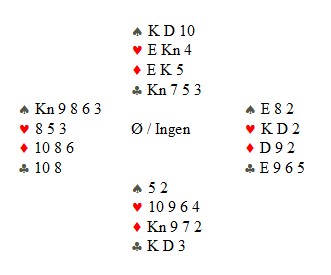Jeg liker disse oppgavene fordi det er av den typer vi møter ofte ved bordet. Tosidige skviser og coup jeg knapt kan uttale navnet på, er unntakene. Mange planer for spilleføringer har ingen andre holdepunkter enn matematiske sannsynligheter, men like ofte har motpartens meldinger (eller at de IKKE meldte) gitt oss hint om at en bestemt fordeling er mer eller mindre sannsynlig enn en annen. Da er nå "table-feelingen" kommer inn i bildet og noen er flinkere til å se for seg hva slagt kort innmelderen han. Dette har med erfaring å gjøre. Jeg legger tar ut trumfen i 6sp og spiller kløver til esset. Kommer kongen på, er spillet over. Kommer knekten eller tieren på i vest. er det en posisjon for begrenset valg. Jeg går inn i bordet og seiler åtteren. KJ eller K10 er dobbelt så sannsynlig som J10. Hvis vest følger med et lite kort under esset og øst med knekt eller ti andre gang fargen spilles fra bordet, teller jeg hvor mange spar han hadde og plusser på ti røde kort. Har han dobbel kløver, gjetter jeg på at det er Kx siden han meldte inn i sonen: Harald Gjellestad er ikke enig med meg og spiller slik: