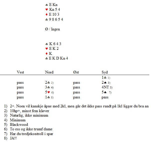 Roald "Luringen" Mæsel åpnet med 2NT og ble værende der. Han fikk kløver ut til dame og ess. Så en liten ruter til Helge Stornes i vest. Han fortsatte med spar ni til liten i bordet. Øst la styrke og Roald stakk med esset (!) Så enda en liten ruter til vest og det er vanskelig å kritiserer Stornes for å spille mer spar. Småpent...