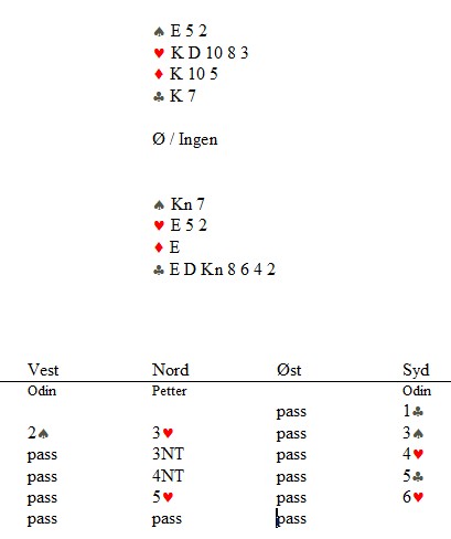 men ikke si at jeg ikke prøvde å forsvare deg. Sånn som jeg (og de fleste andre? ) spiller avslag med 5 i major etter svar på Blackwood, så måtte du melde 6hj fordi du ikke hadde det (jeg trodde) makker spurte om, nemlig trumfdamen. Så sender Petter Tøndel fasitsvaret og de har konvensjon for dette. 5hj betyr noen ting, men det må Odin rett og slett ha glemt. Derfor overskriften. (Jeg antar det er akkurat det samme Boye mener når han sier at "5hj-melderen må ha trumfdamen selv") Her kommer Petter sitt svar.