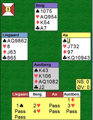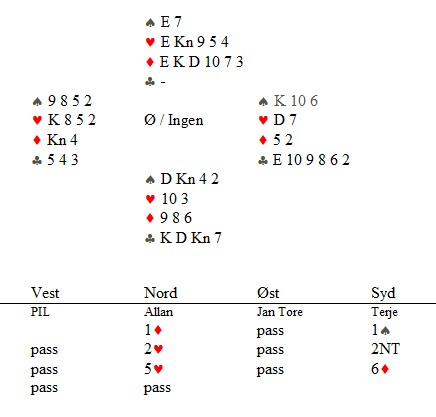 Når en åpner på 1-trinnet med Allan sine kort, sitter en med hjertet i halsen og håper på å overleve første melderunde. Det går nesten aldri pass rundt på slike hender, fordi motparten har også normalt fordelingshender. Det som gjerne skjer videre i meldingsforløpet, er at åpneren sitter med et ønske om å fortelle makker at han har en kanonhånd, LANGT sterkere enn makker i sine drømmer kan forestille seg. Jeg skønner godt at Allan i nord ønsket å formidle det og 5hj var i alle fall ingen undermelding. Det presset Terje Aa til å melde slem i ruter, men han hadde sikkert en mistanke om at makker sannsynlivis ikke hadde mye bruk for hans svarte honnører. Så skal Jan Tore Berg spille ut. Det er vel kun hjerter i utspill som er uaktuelt. Både spar, ruter og kløver kan være rett. Han prøvde å få for kløver ess og det ble katastrofalt. Det var nå mange måter å spille hjem tolv stikk på og et kjemperesultat til LAST.