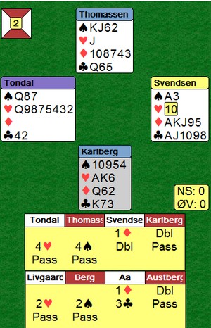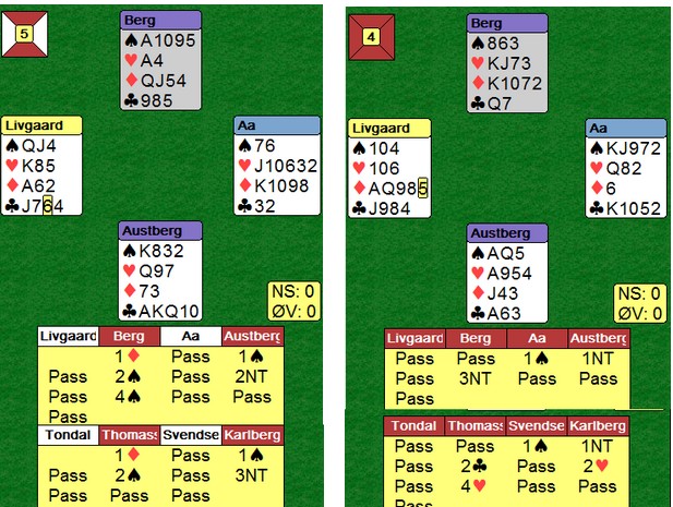 Det er rett og slett slitsomt å følge med finalen, fordi det er poenger i nesten hvert spill. Masse gode prestasjoner!! Glimrende av Allan og Terje.. I dette spillet var Allan og Terje og slett flinkere enn Petter og Odin, Jeg vet ikke om spillefører Jan Tore Berg kunne forstått hva som var i ferd med å skje? Terje Aa spilt ut spar knekt til konge og ess. Allan tok også for spardame. Nå er det fort gjort å gi makker en stjeling, men det er parturneringsbridge. Hvor skal beita komme fra? Makker kan ha Kx i ruter. Det er den eneste gangen det er rett å spille spar: Terje Aa la styrke i kløver i stikk tre. Makker var lydig i skifta til kløver. Nå vet jeg ikke om Jan Tore kunne løst hjerteren, men det er sikkert for mye å forlange. Det hadde sett sinnsykt dumt ut å kappe hvis fargen satt 3-2. Med kløverskiften og EK i hjerter, ble det beit. Odn på det andre bordet la svakhet i ruter med ruter 9. Det fortalte Petter at ruteren ga de nødvendige avkastene, men kunne ikke makker hatt DJxx i hjerter og ikke kløverhonnører? Han spilte mer spar og da ble det ti lette stikk. 1-0 til Allan - Terje. Så en tøff melding av Petter Tøndel Han satte maksimalt press på Kurt Ove i nord og han måtte ta stilling til hvem som hadde hvilke kort. EK i hjerter hos makker (!) var i alle fall ikke det han forestilte seg. 4sp kosta 500 mot ingenting over tre-trinnet hos motparten. 1-1