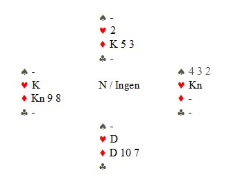 Hmmm.. Her er svarene jeg har fått hittil. Knut Erik Ljung: Hei Snorre Logikk: 4 ru fastsetter ruter som trumf og er (minst mild) sleminvitt. (3 ru viser bare trumfstøtte). Du har to akseptable meldinger: 5 ru (du har ei klar minimumshånd). 4 hj (som jeg ville ha valgt). Selv med kliss minimum, har du god trumffarge, og hjerter konge kan være gull. Mvh Kel ---------------------------------------------------------------------------------------------------------------------------- Kåre Beyer E dt mulig! Sykebil ville en bekjent av meg ropt og gjerne to med det samme. Seriøst pass? Du gjorde ikke det da? Det kan ikke være slik at en spiller av Kvangravens kaliber ikke har en mening med 4 ruter i en slik poss. 4 ruter blackwood? kreves ikke que fra begge spillere for at den er aktiv? Egentlig finnes det ikke ord for slikt som dette….. God bedring ønskes!